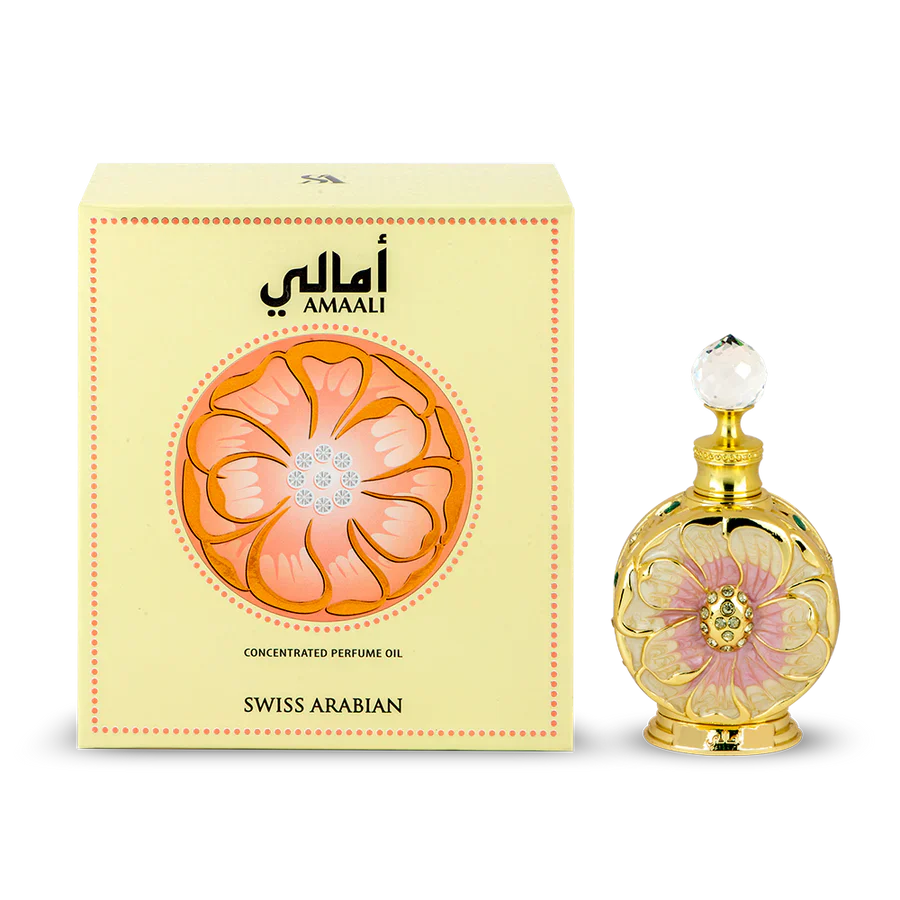 Amaali is a dedication to a woman with high hopes and big dreams. She seeks to achieve the impossible. She wears her heart on her sleeve and has a sparkle in her eyes. Amaali opens with juicy pineapple, crisp green apple and zesty lemon. Making a statement right from the start, the colorful fruits add life to a cold night. A breathtakingly feminine bouquet of white jasmine petals and deep red roses bring the heart of the fragrance out into the moonlit air, leaving an enchanting floral trail in your wake. This fragrance, just like the woman who wears it, is full of surprises. As the petals meld seamlessly into woody sensual territory, a radiant accord of golden vanilla and silky caramel emerges, making you smell unforgettably delicious all night long. Amaali for her is a concentrated perfume oil.