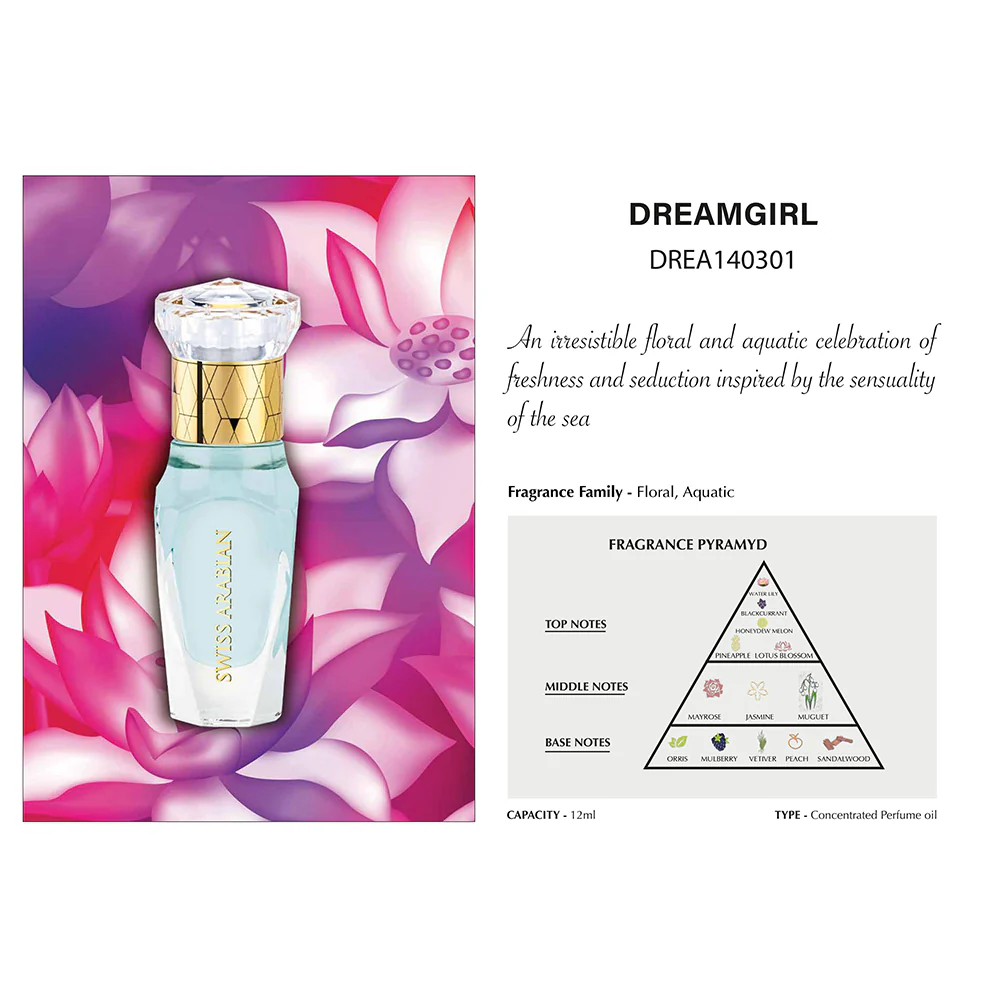 Dream Girl is a floral, fruity fragrance for women. Opens with finest notes of Blackcurrant, Honeydew Melon, and uplifting Pineapple. The beating heart of the fragrance consists of Mayrose, Muguet, and Jasmine. Orris, Sandalwood, Peach, Mulberry, and Vetiver add depth to the aroma.