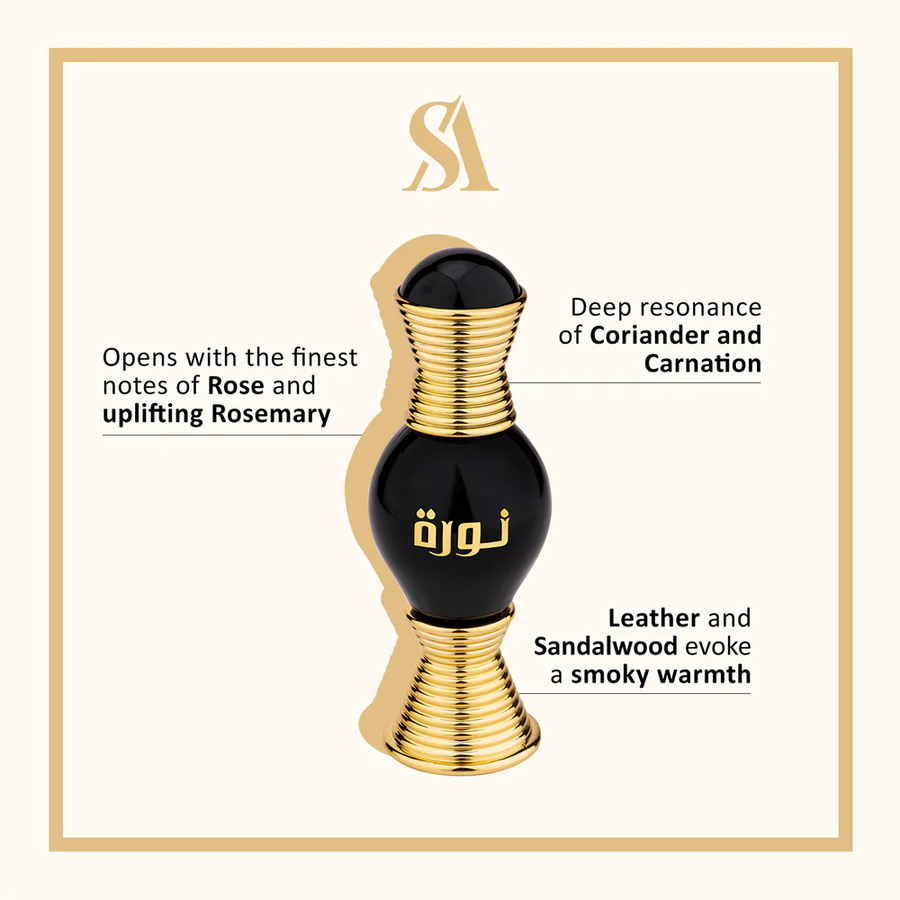 The fragrance opens with a note of Rose, Rosemary, Artemisia, Lavender and Lemon notes. This is followed by Coriander, Carnation, Cinnamon, Juniper and Jasmine. The base notes include Leather, Sandalwood, Fir, Amber, Patchouli, Oak Moss, Vetiver, Cedar and Vanilla. Noora Onyx is a fragrance for women.